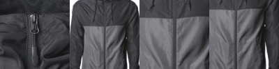 • Raw-edge hood opening, pocket seams, cuffs, waistband, zipper placket and side seams