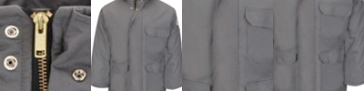 • Heavy-duty brass ratcheting zipper, button closures