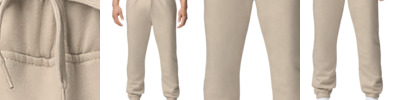8.4-ounce, 80/20 ring spun cotton/polyester 75/25 ring spun cotton/polyester (Ring Spun Sport Grey) 100% ring spun cotton face Covered elastic waistband with interior white drawcords Slanted side pockets Differential front and back rise for better fit Tapered legs Elasticized cuffs Classic fit Recycled, high-performing black tear-away label