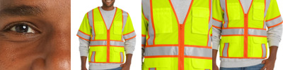 Built for surveyors or anyone who needs the highest ANSI visibility, this breathable, comfortable two-tone vest has short sleeves to meet ANSI 107 Class 3 requirements. 100% polyester mesh for breathability 100% polyester tricot exterior pockets for durability and easy decoration Durable, reflective 2-inch tape meets ANSI 107 requirements and provides 360-degree visibility on body and sleeves Two-tone contrast polyester tricot fabric under reflective tape; contrast binding Left chest bellows pocket with flap and hook and loop closure Two layered right chest pockets: one open, one divided Two lower front flap pockets with hook and loop closures Interior open lower mesh pockets on both sides Mic clip at left chest for easy access Molded center front zippered closure This garment must be fully zipped to be in compliance with ANSI 107 standards